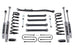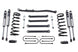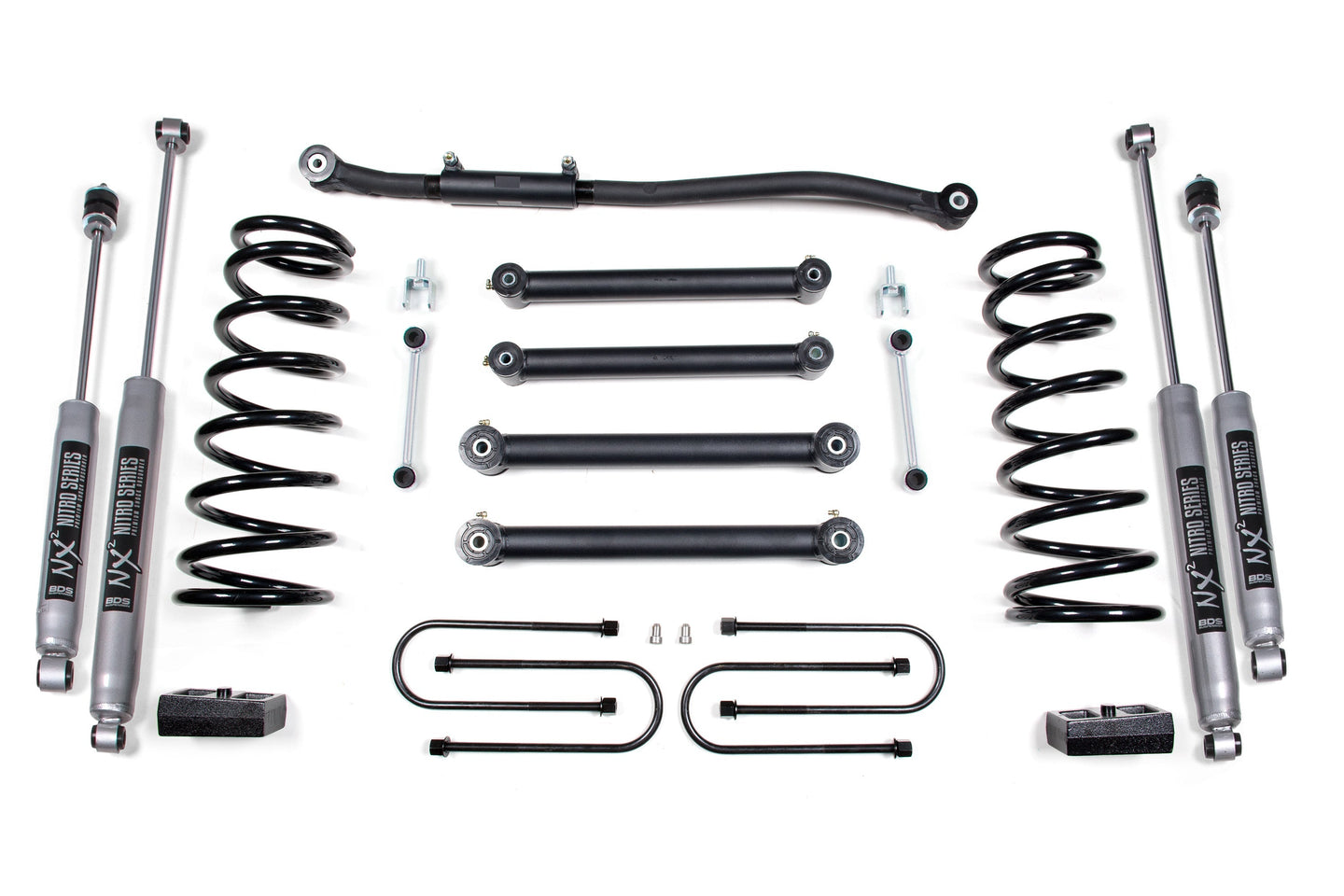 Up front the lift kit includes gas-specific Pro-Ride coil springs, heavy duty adjustable track bar, fixed length tubular upper and lower control arms, fixed length sway bar links with stud eliminator, and precision tuned NX2 or FOX 2.0 nitrogen charged shocks. In the rear this kit utilizes heavy duty cast steel blocks, longer u-bolts, and a matching set of NX2 Nitro or FOX 2.0 Performance shocks.