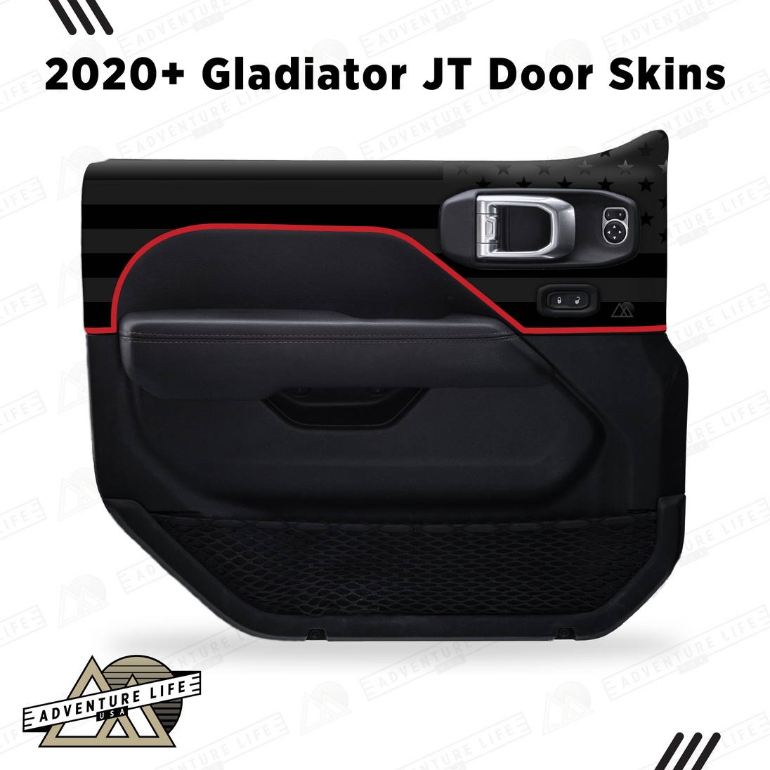 Upgrade your 2020+ Gladiator JT with Adventure Life’s Black Flag Door Skins—the perfect blend of style and function. Made from premium automotive vinyl, these skins wrap flawlessly around your doors for a durable, weather-resistant shield against dirt, mud, and daily adventures. The matte black base with gloss black stars and stripes provides a sleek, head-turning design that complements any off-road build.
