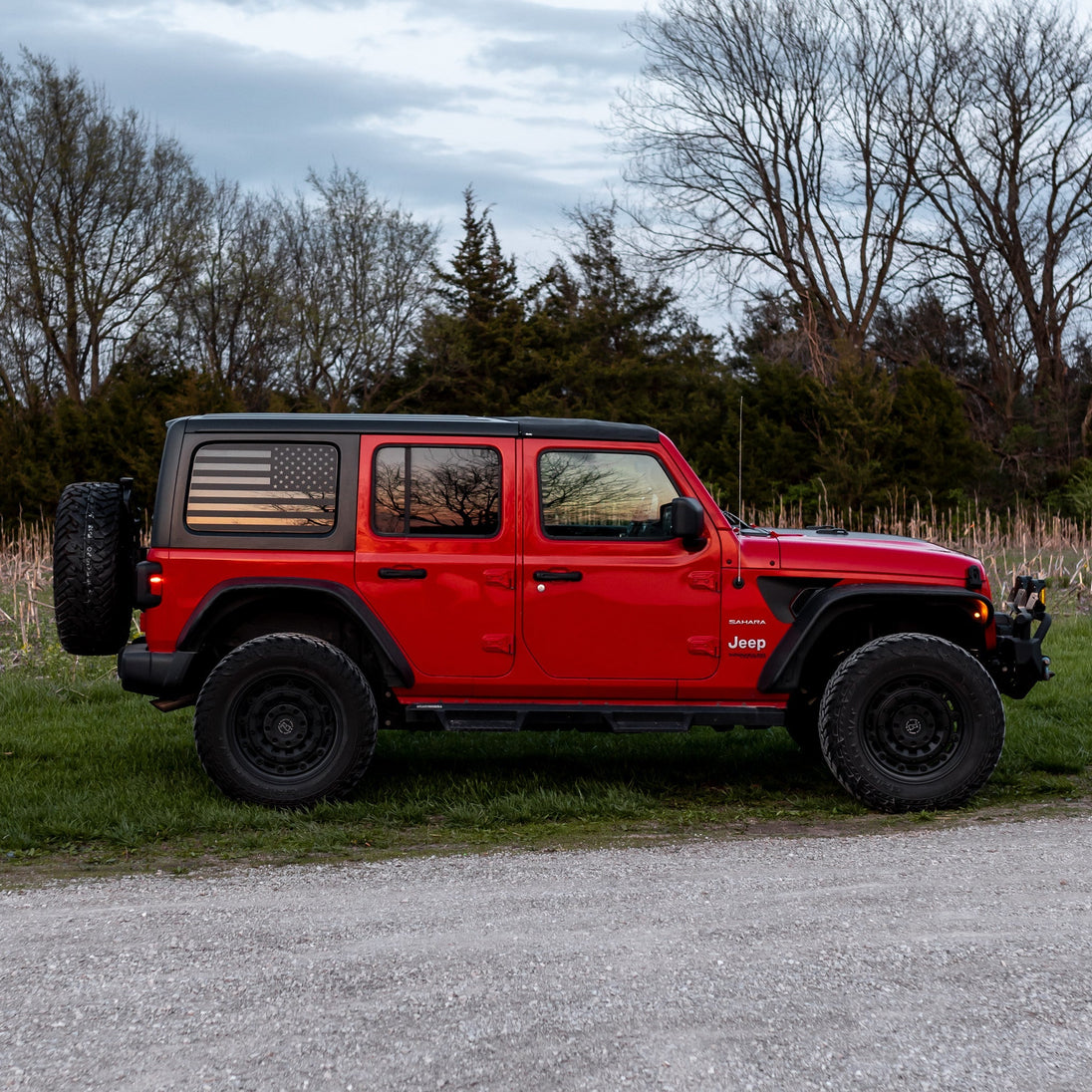 (2) Pre-Cut Window Graphics for Driver and Passenger sides. Clear Window Vinyl with Black Flag Print