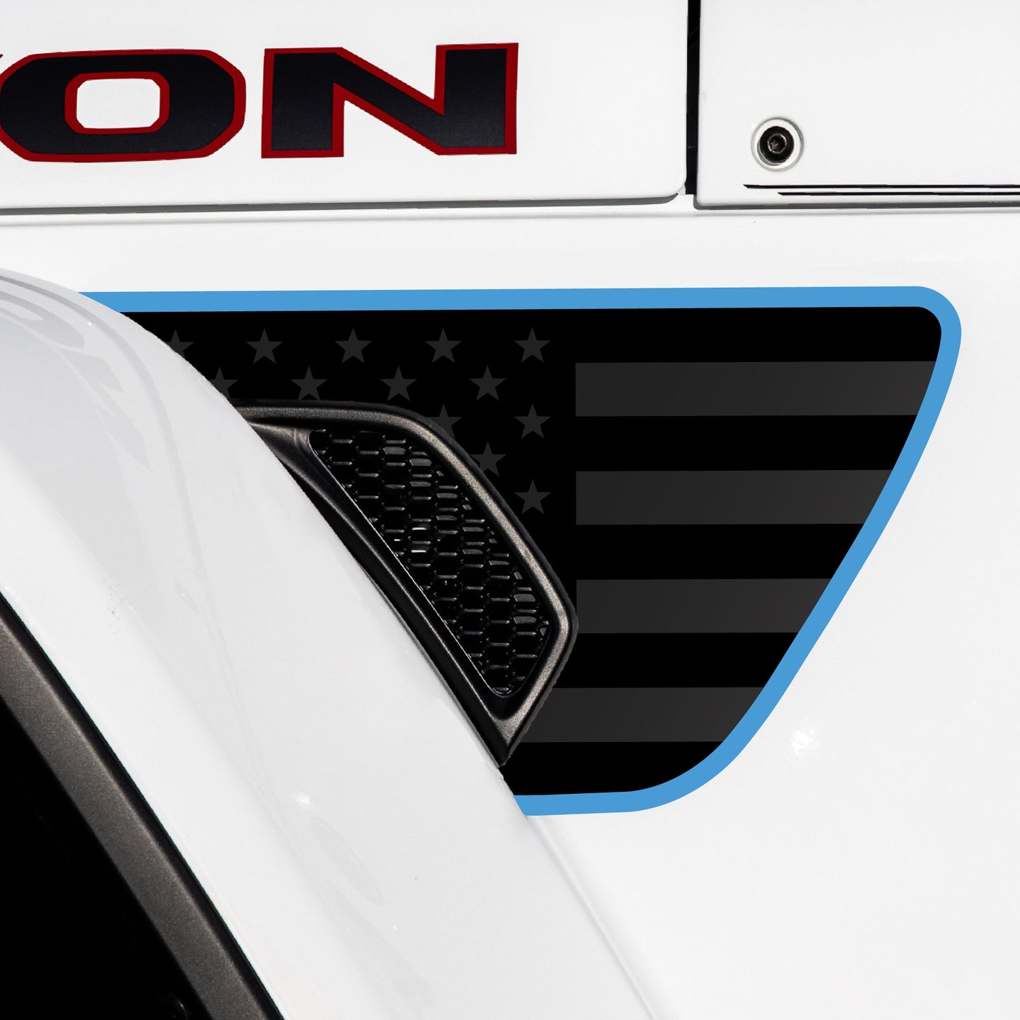 Black on Black American Flag vehicle wrap decal that is precisely and intentionally designed to wrap the recessed part of the fender behind the front fender flares. *Pictured with Rubicon Fenders*