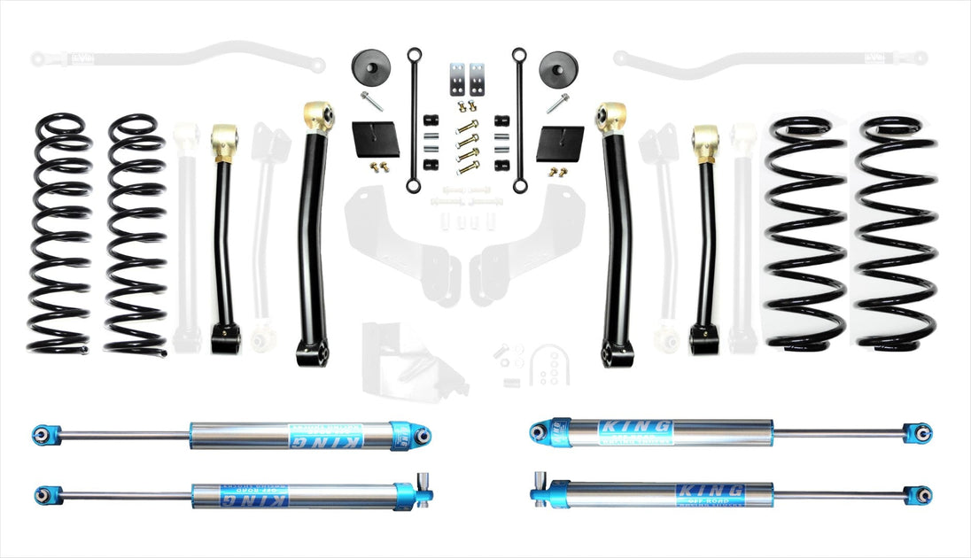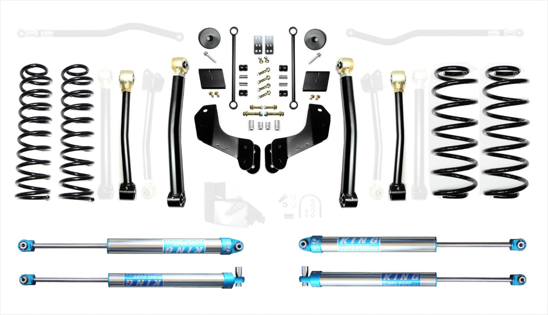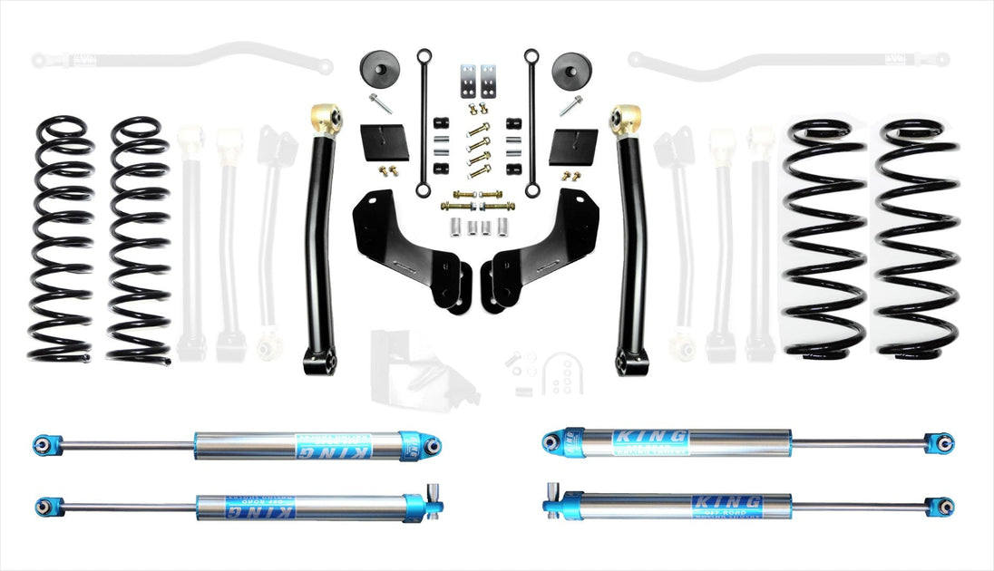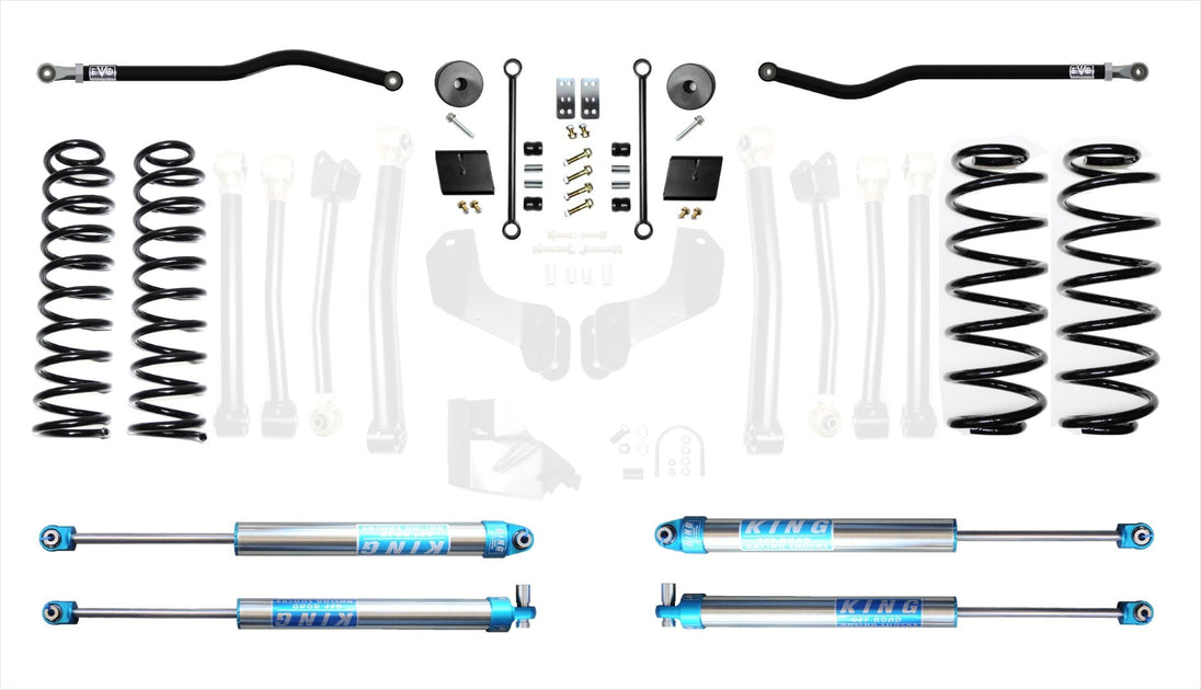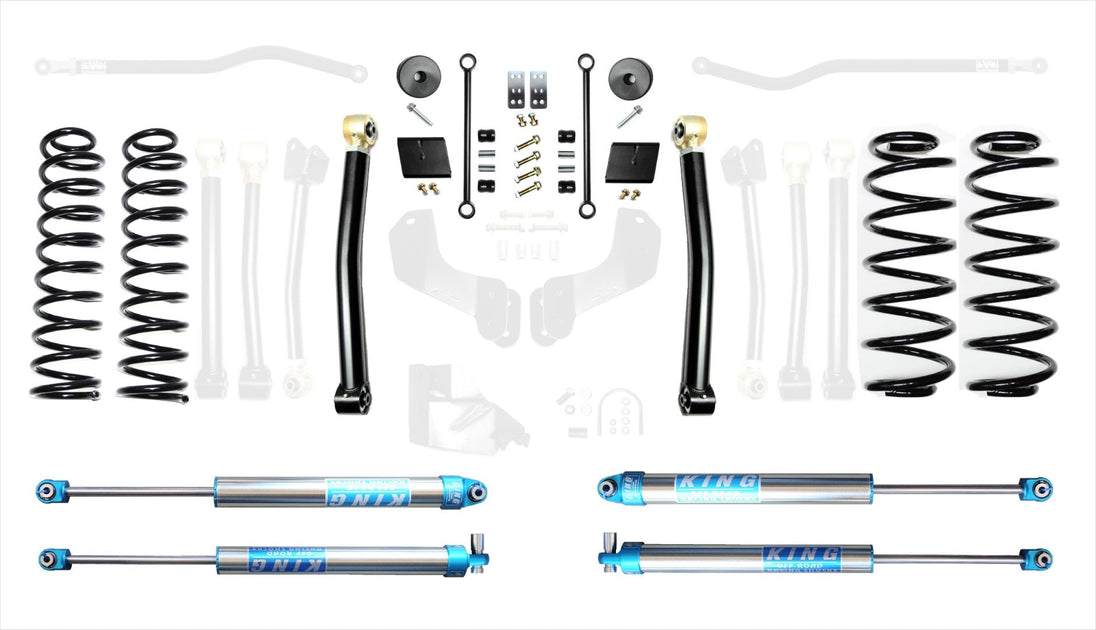 The difference with EVO MFG Enforcer Overland systems vs EVO MFG Enforcer systems is the use of front Overland Control Arm Brackets. When lifting your vehicle your control arms at ride height have a steeper angle towards the floor which can have some negative effect/chop in ride quality. With the use of the included Overland Control Arm brackets we relocate the front control arm mounting locations at the frame. In doing this when lifted we maintain factory flatter control arm angles and while minimal, we alleviate much of the chop associated with lifting a Jeep giving even better and more improved ride quality. Also, in the use of Overland Drop Brackets we are able to engineer more performance into the front suspension to improve braking and driveline angles through suspension cycle. Both kits drive very well, the Overland Kits are better suited for less hard off-road crawling and more light off road and on road use.