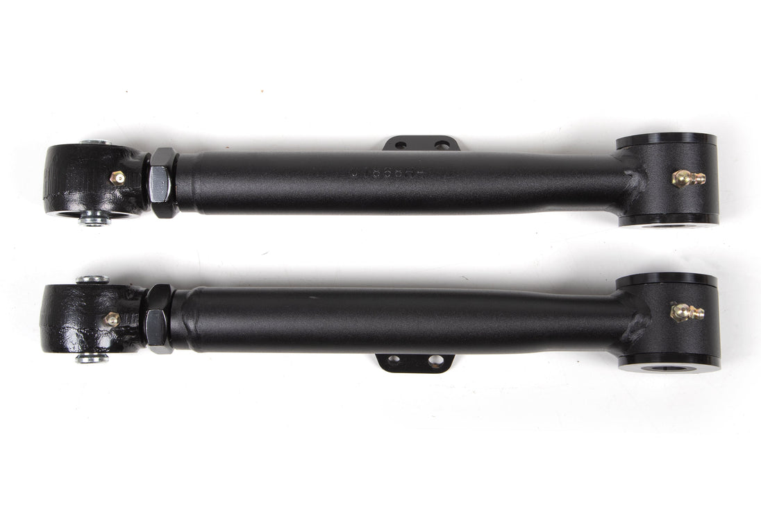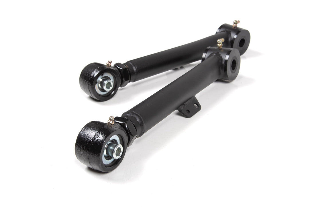 At the axle end they utilize an OE-style poly bushing for long service-free operation and better isolation of noise, vibration, and harshness (NVH). At the frame mount they feature a large, forged flex end for strength, durability, and off-road articulation. The forged flex ends allow length adjustments to correctly position the rear axle and correct caster. Capable of 15-degrees of misalignment in either direction for more flex out on the trail.