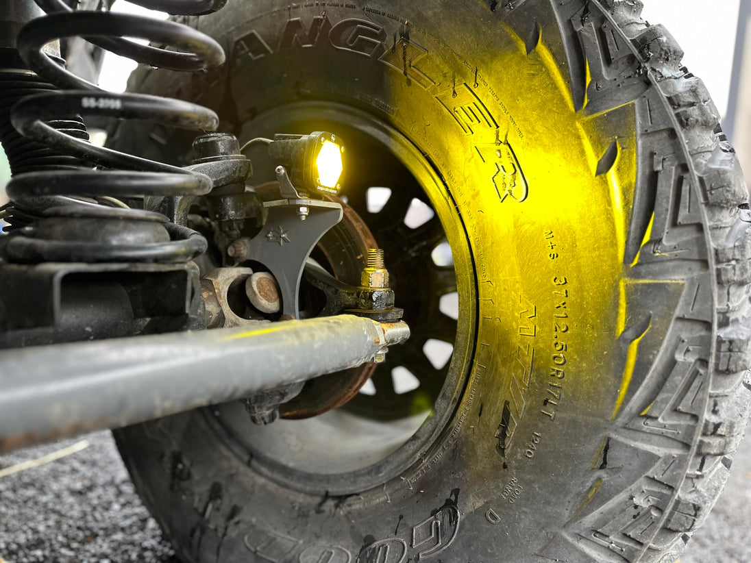Knuckle Pod Mounts are revolutionary Steerable Light Brackets that are engineered to bolt to your steering knuckles to enhance your on and off-road visibility and safety by synchronizing your fog lights with your steering wheel movements. This allows better and wider visibility when turning in dark areas (especially with tinted windows), flexing out on obstacles, or simply driving down back roads at night.