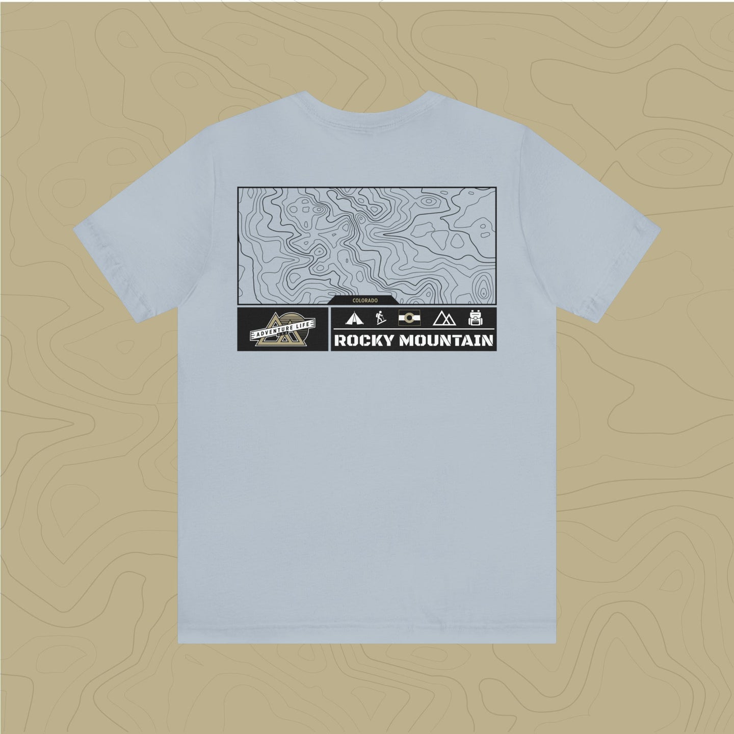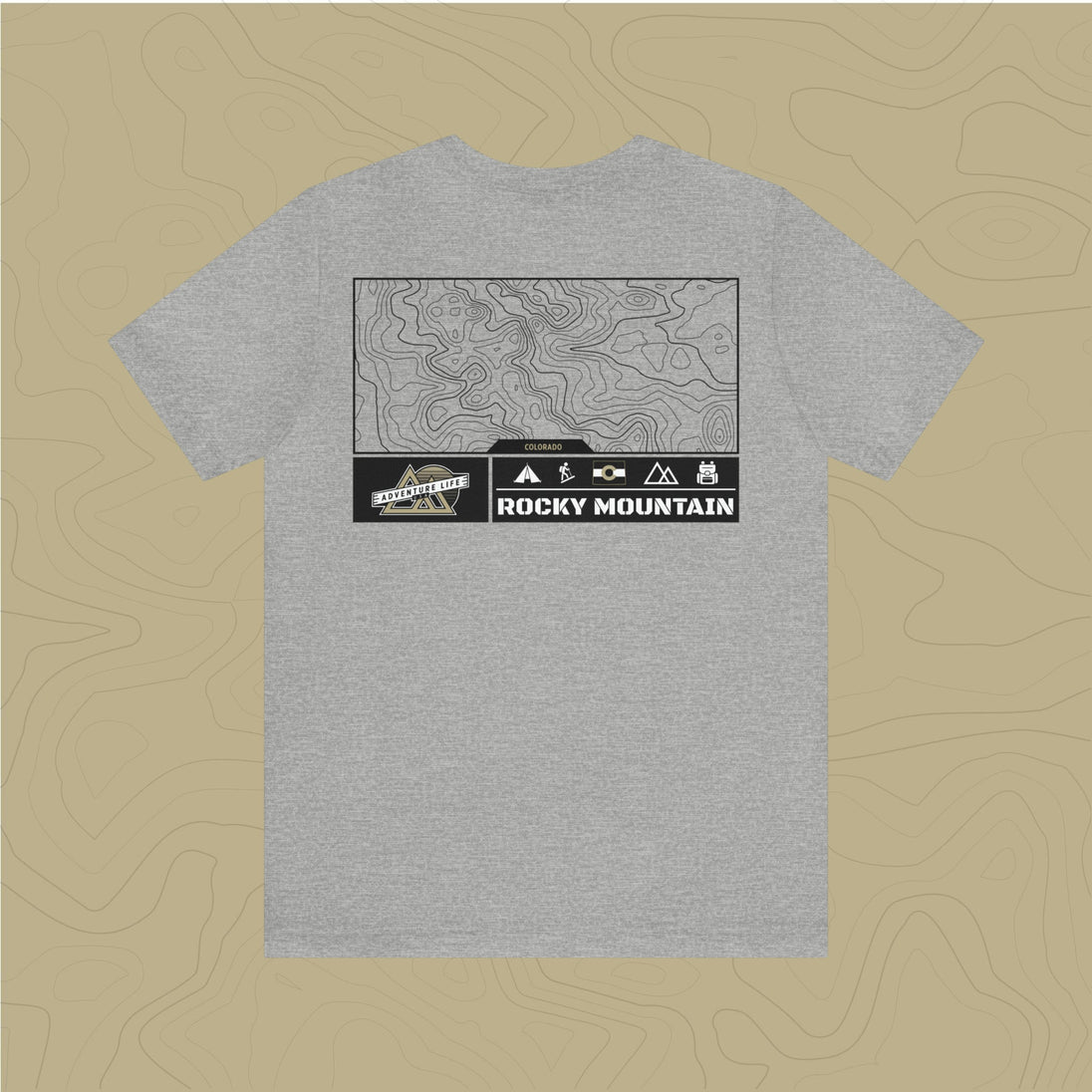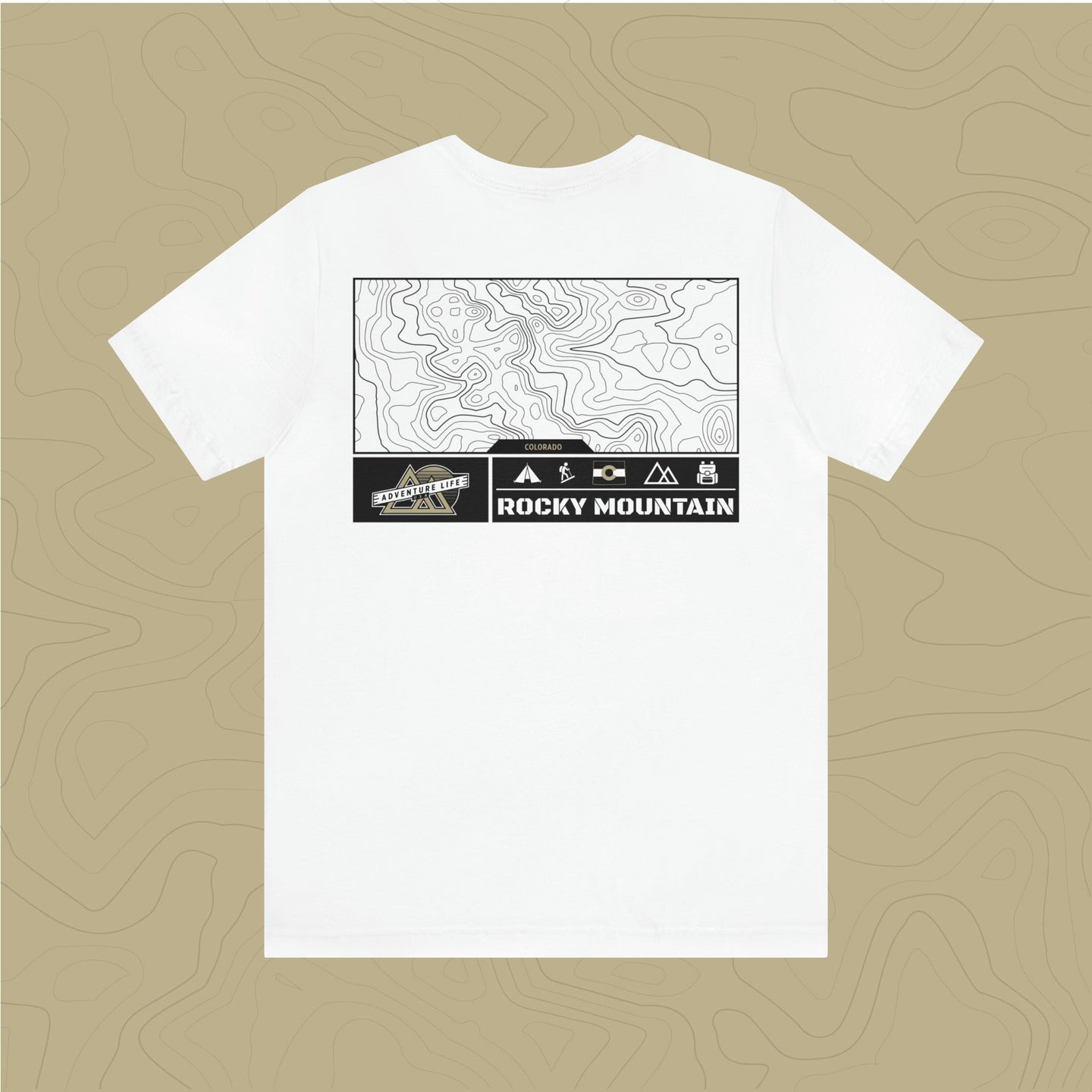 Embrace the adventure of Rocky Mountain National Park with our topographic map tee, a tribute to nature's beauty.