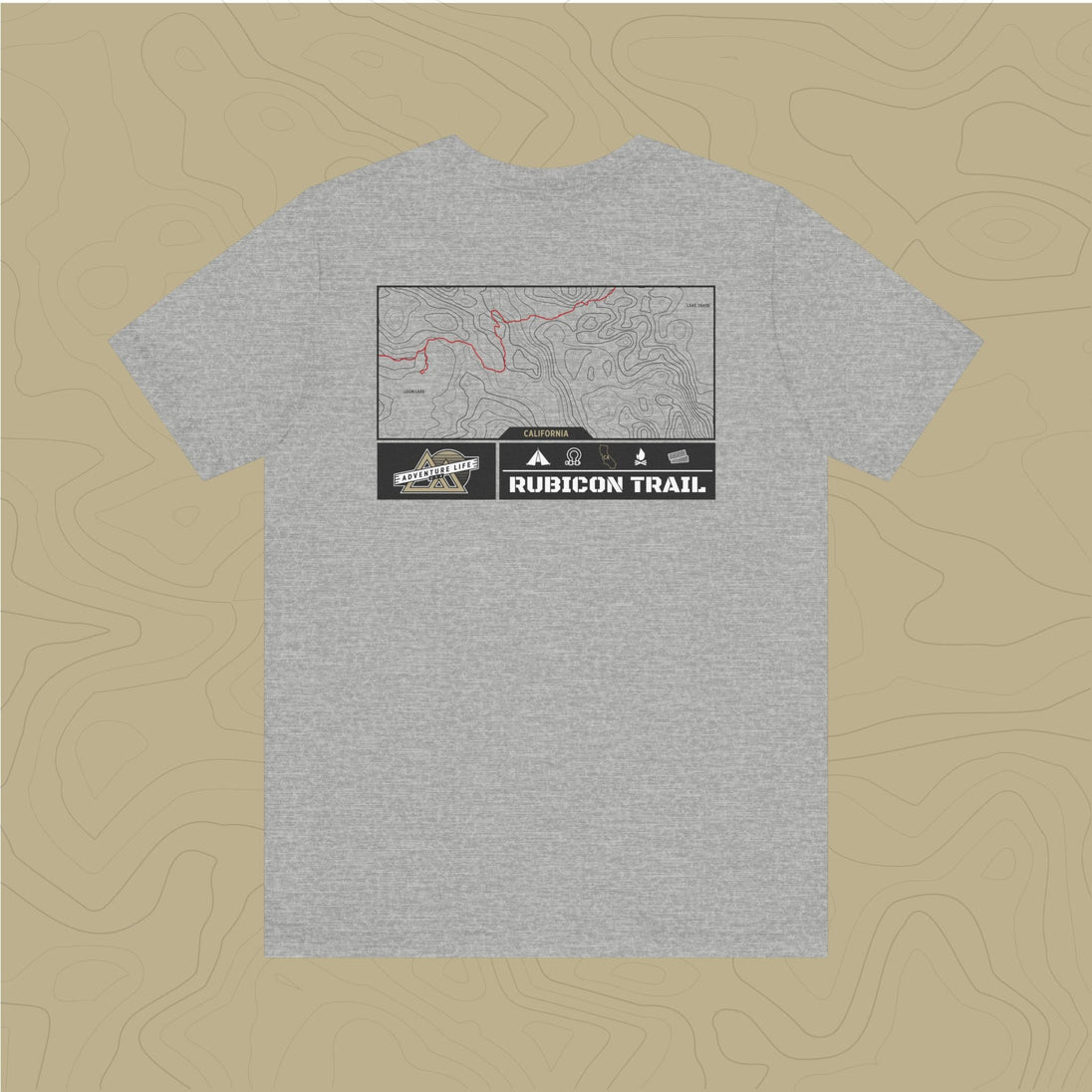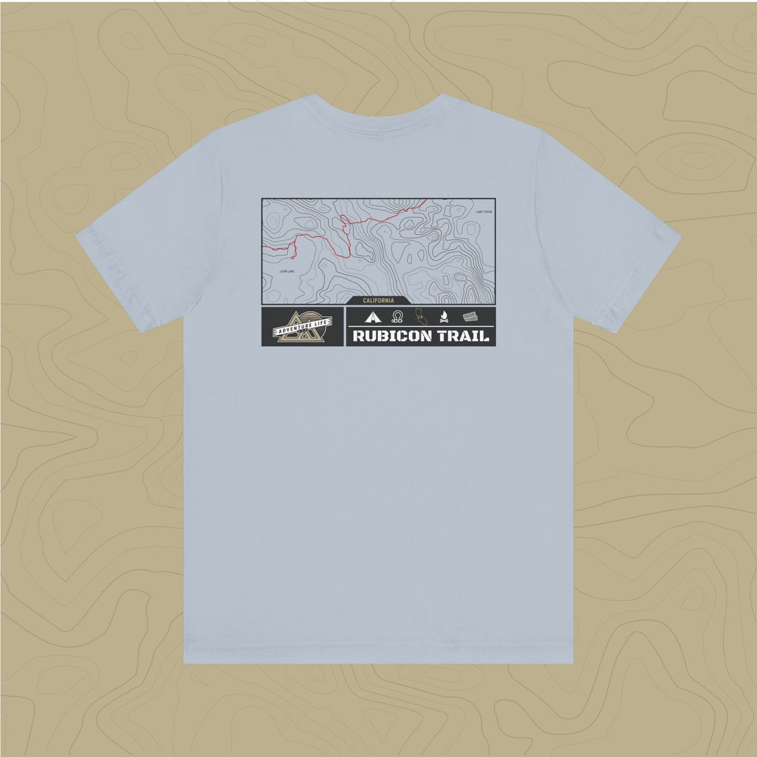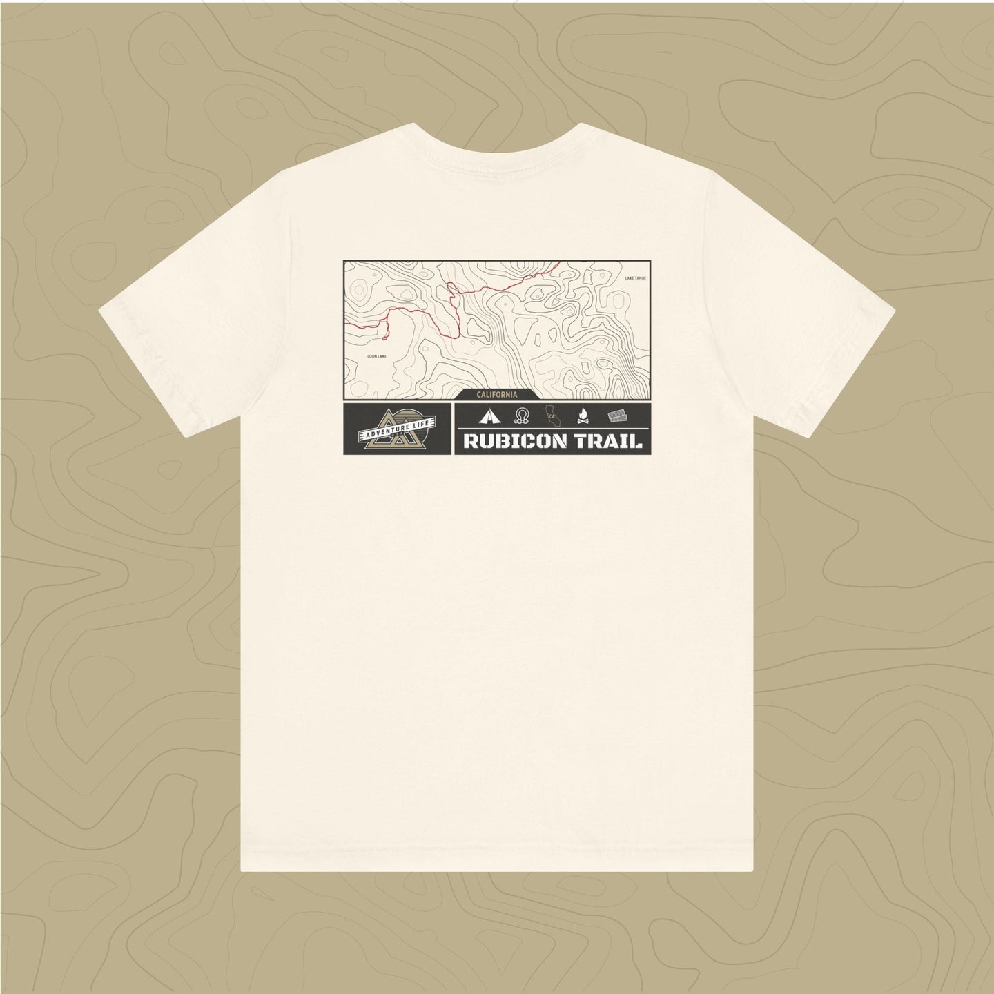 Embrace the adventure of  the untamed Rubicon Trail with out topographic map tee, a tribute to nature's rugged beauty.