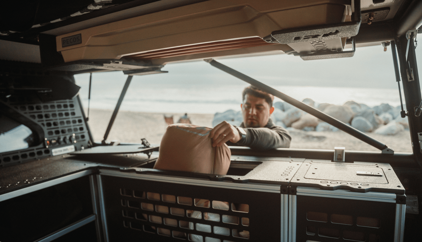 Bed Cargo Module – A secure, strap-in storage solution utilizing factory anchor points. Compatible with optional Step 22 Stingray Flat Box bags for enhanced organization.