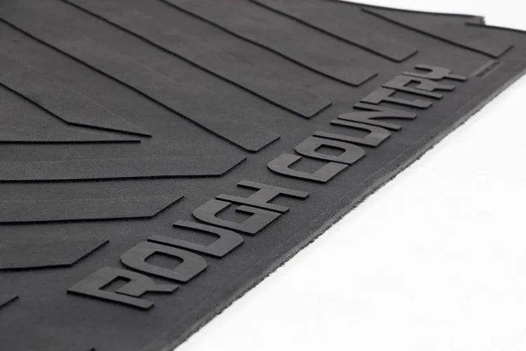Innovative Design and Material. Keep your truck bed free from scuffs, scrapes, and scratches with Rough Country Truck Bed Mats. These heavy-duty, 3/8-inch thick, contoured rubber mats are nearly indestructible; made from a high-quality rubber compound that won’t crack in extreme temperatures or fade when exposed to the sun. This stylized bed mat features a large "RC" and "Rough Country" logo with angled lines for an improved look that also protects your truck bed.