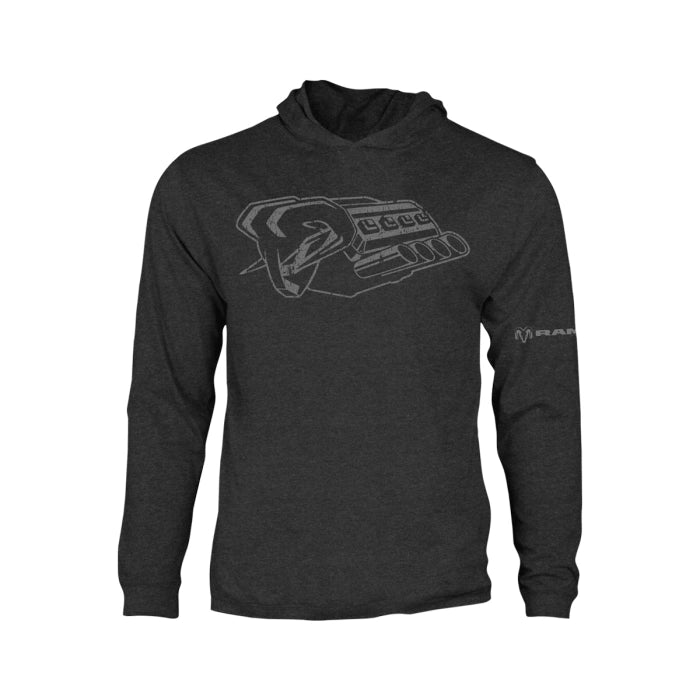 Stay comfortable and ready for any adventure in this Ram HEMI® long sleeve hoodie t-shirt. Made from a soft 60/40 cotton-poly blend, it features a hooded pullover design and long sleeves for versatile wear. The front chest displays the Ram HEMI® logo in light gray, while the left sleeve shows the Ram horizontal logo—perfect details for showcasing your Ram pride in style.